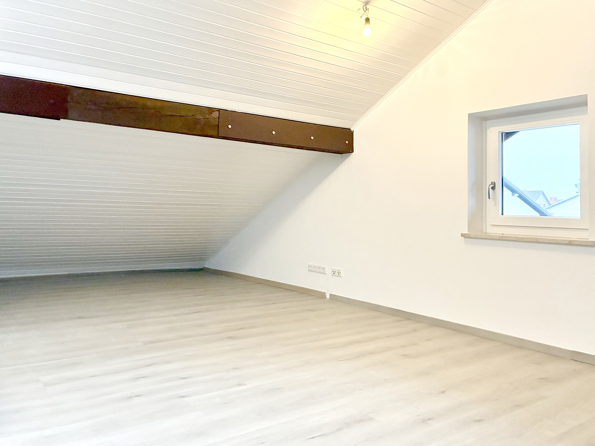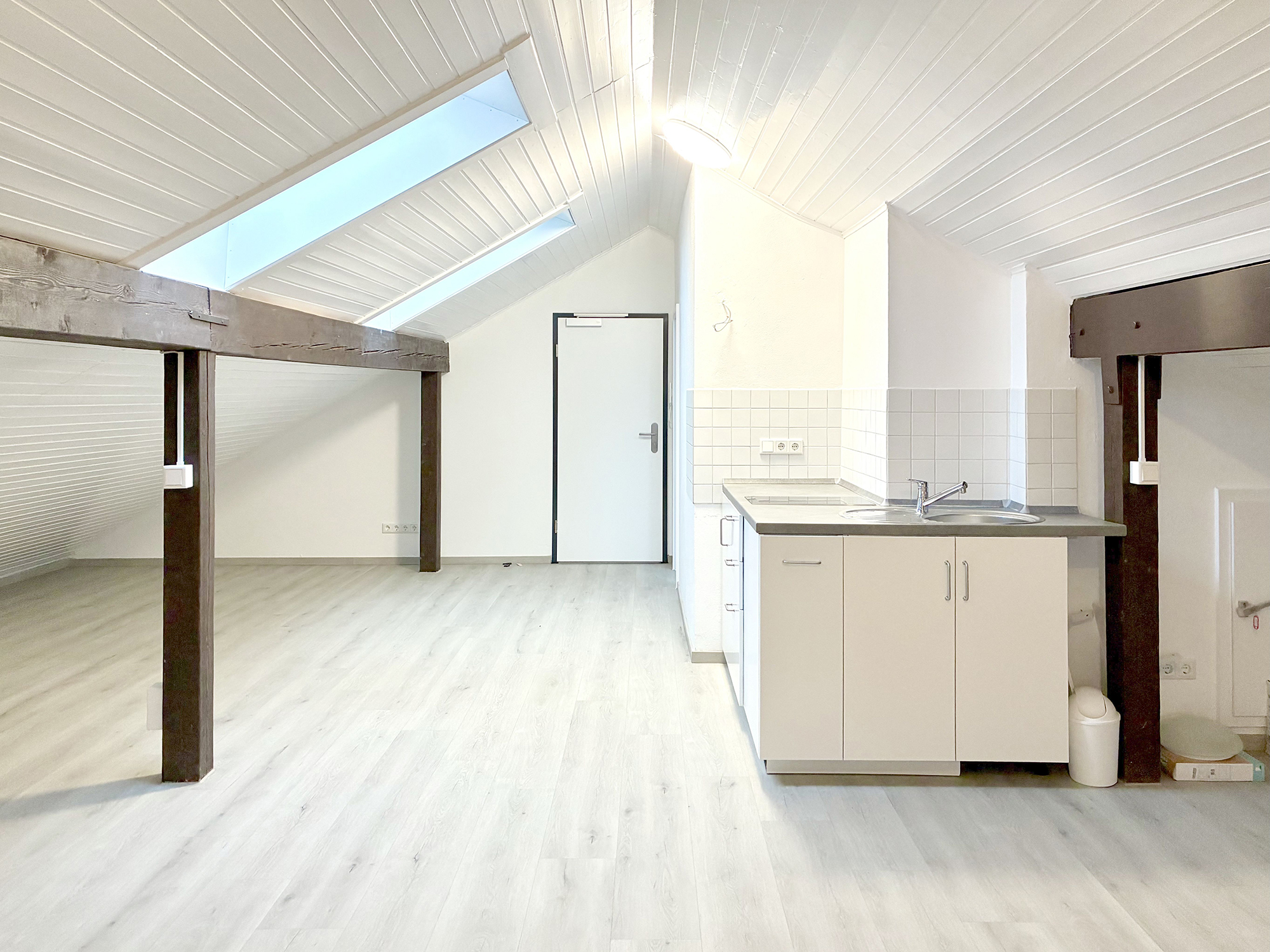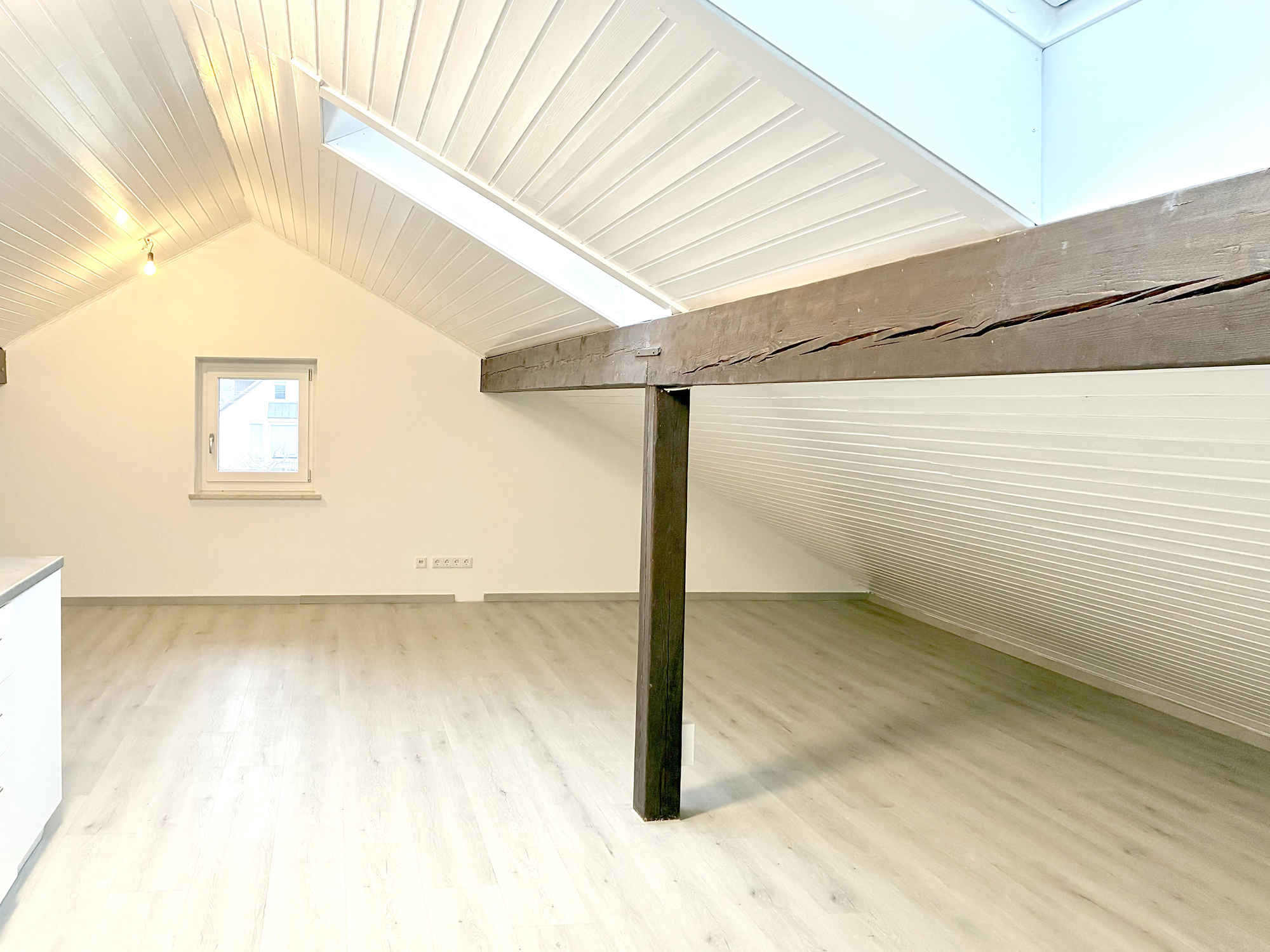 Der Wohn- und Schlafbereich ist mit einem Vinylboden in Parkettoptik ausgestattet und wird über eine komfortable Fußbodenheizung beheizt. Das neue, elegant gestaltete Duschbad ist hell gefliest und verfügt über ein Dachflächenfenster, das für viel Tageslicht und gute Belüftung sorgt.