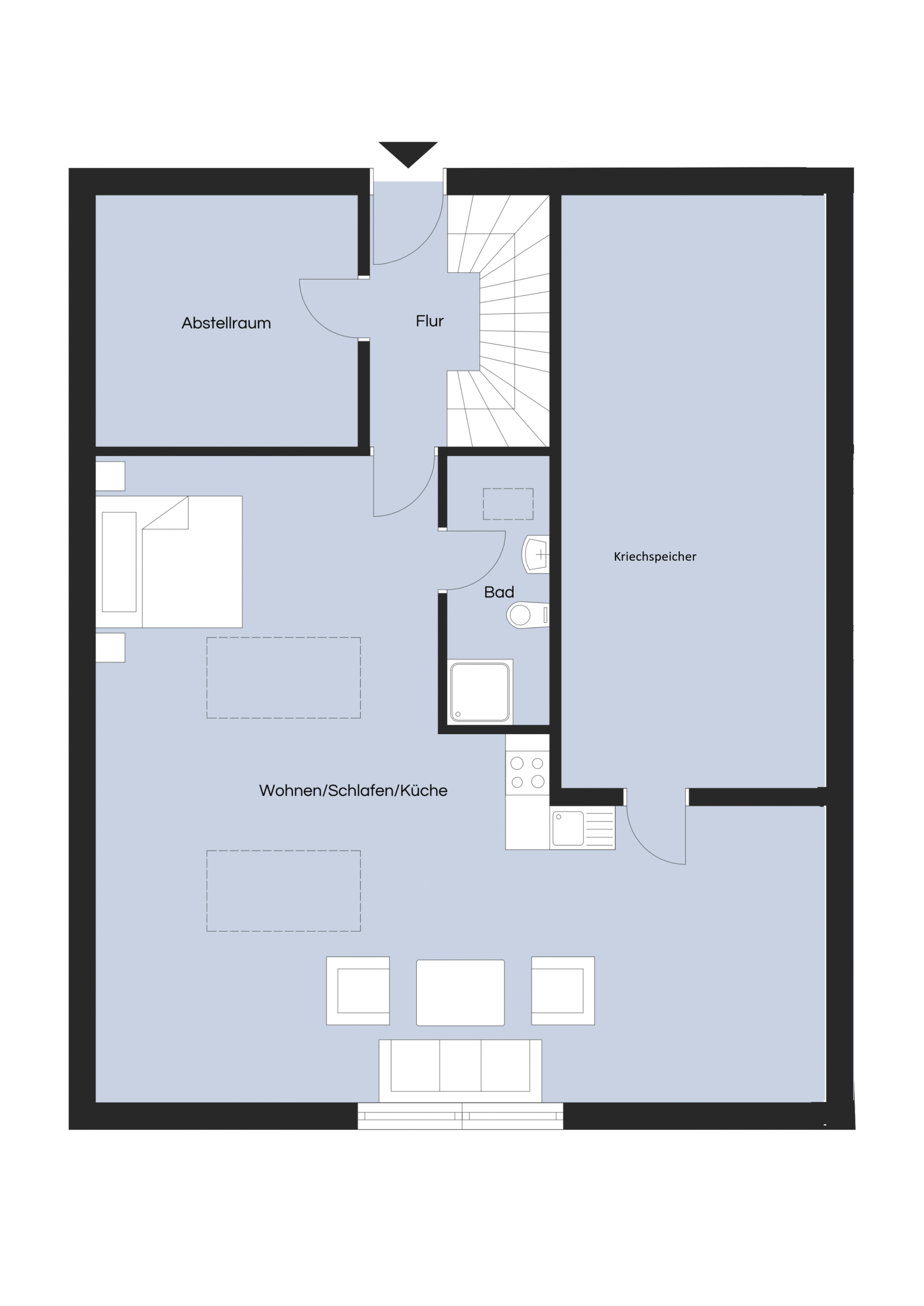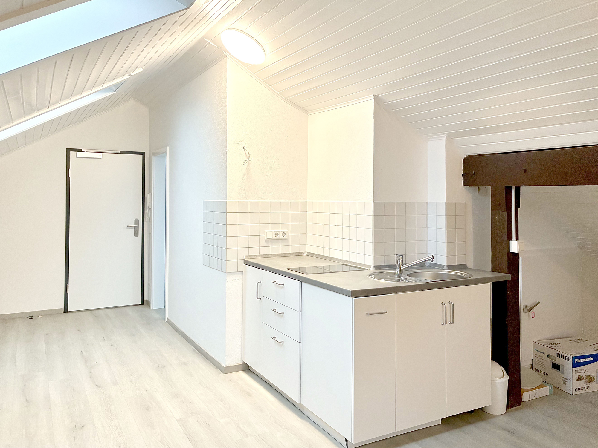 Eine kleine Küchenzeile mit Spüle und 2-Flammen-Cerankochfeld ist bereits integriert und ermöglicht einen sofortigen Einzug. Ergänzt wird das Platzangebot durch einen ca. 4 m² großen Abstellraum, der sich auf derselben Ebene wie die Wohnung befindet.