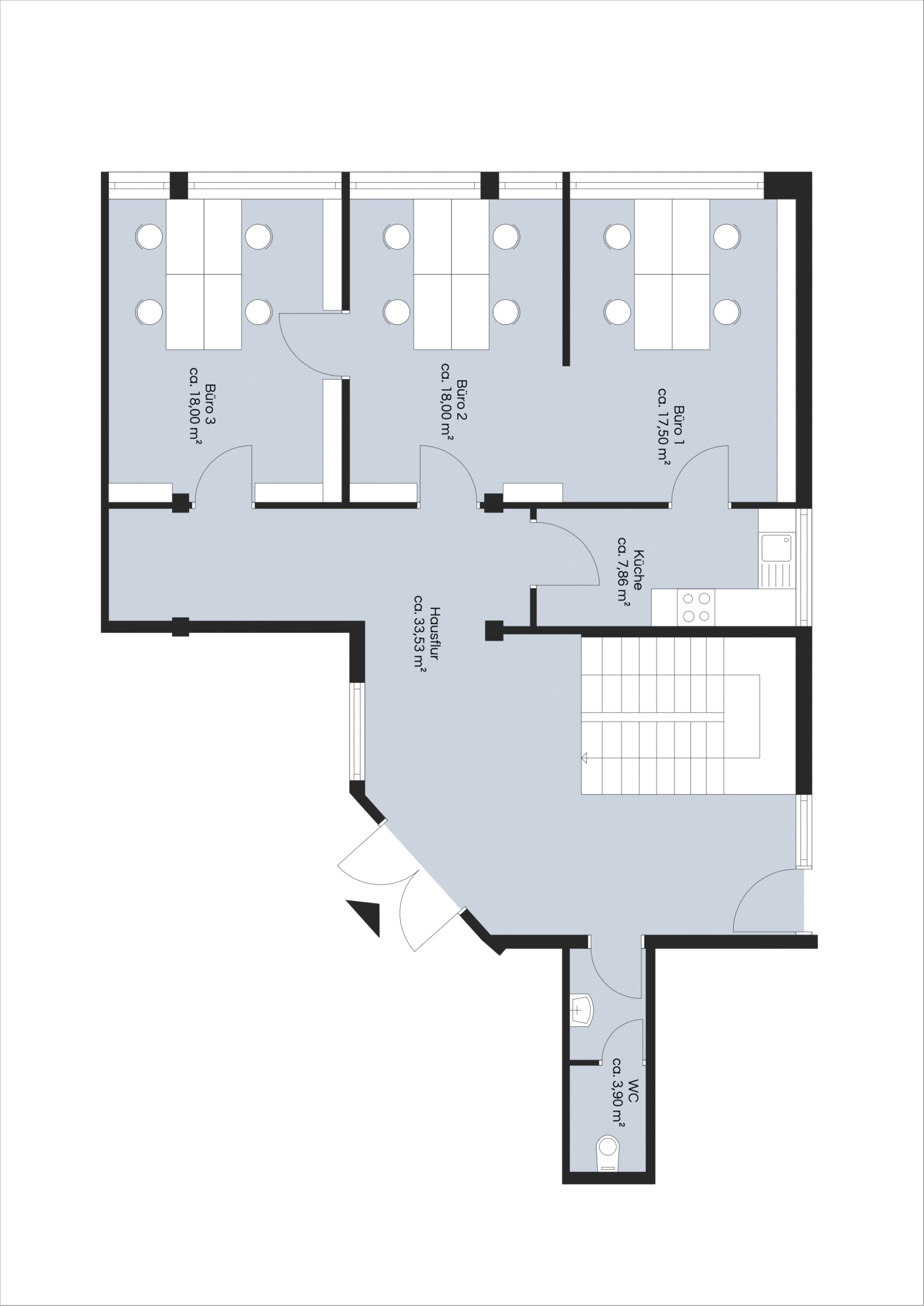 Die Bürofläche umfasst insgesamt drei gut geschnittene Büroräume, eine separate Küche sowie ein WC. Die Räumlichkeiten eignen sich ideal für kleinere Unternehmen, Dienstleister, Agenturen oder Freiberufler, die Wert auf eine funktionale und repräsentative Arbeitsumgebung legen.