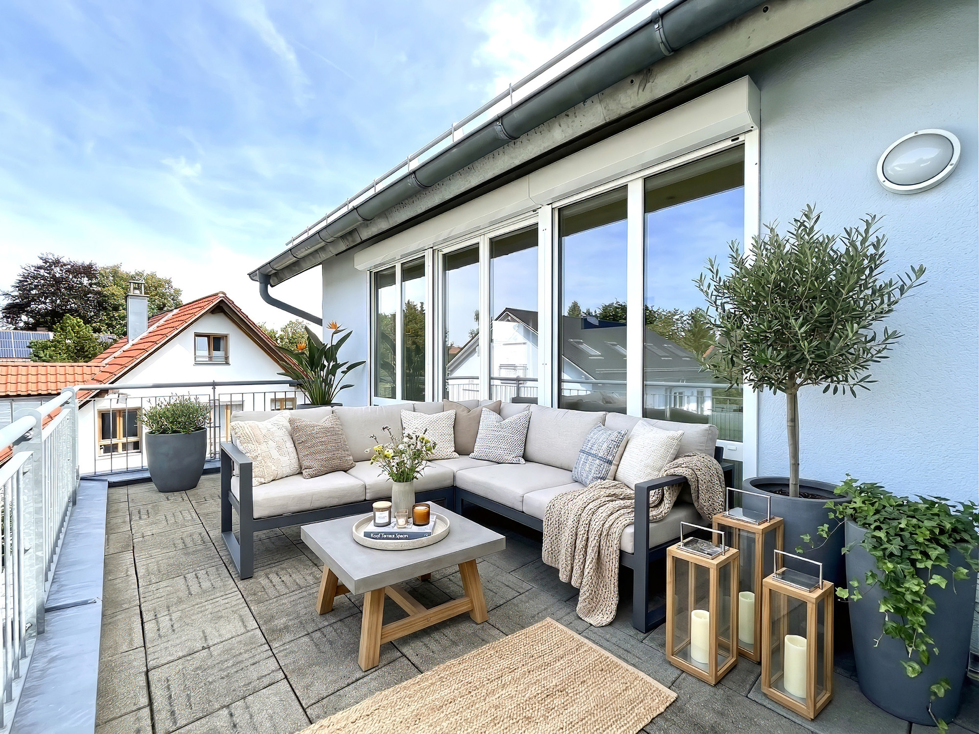 Das Haus bietet zudem zwei attraktive Außenbereiche: Eine sonnige Dachterrasse mit Abendsonne lädt zum Entspannen ein, während die klassische Terrasse im Erdgeschoss direkt an den Wohnbereich anschließt und in einen schön angelegten Garten übergeht – ideal für Kinder, Gartenliebhaber oder gesellige Stunden im Freien.