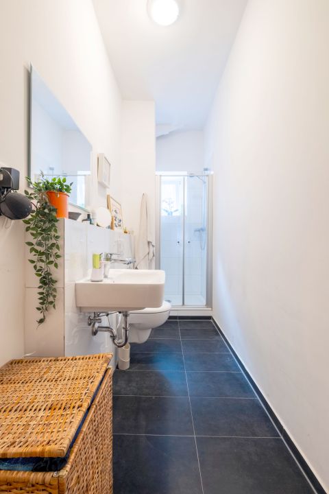 Ein besonderes Highlight ist die außergewöhnliche Deckenhöhe von ca. 2,90m² – ungewöhnlich für einen Nicht-Altbau – und verantwortlich für ein angenehm luftiges Raumgefühl. Großformatige Fliesen im Bad sowie gepflegter Parkettboden in den Wohnräumen unterstreichen das stilvolle und urbane Ambiente.