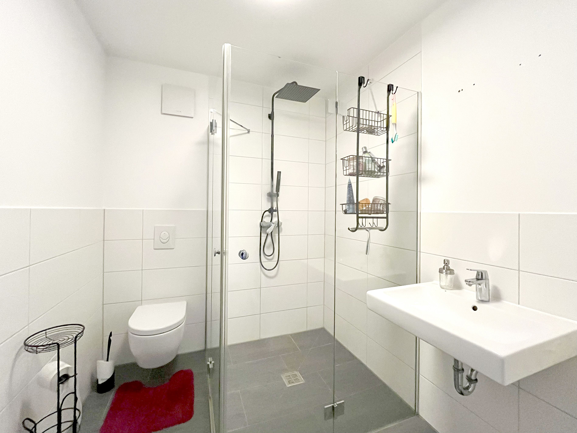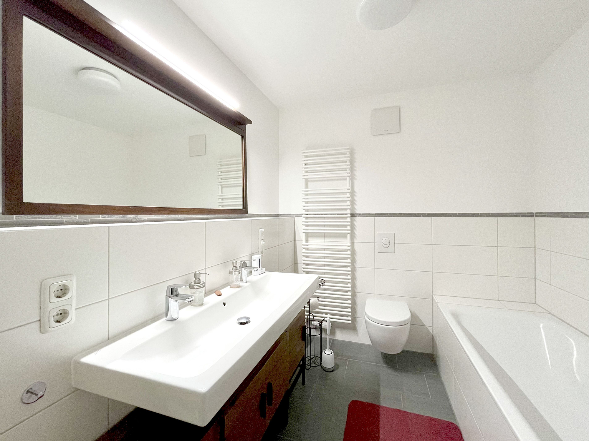 Die Wohnung verfügt über zwei Bäder: ein modernes Gäste-WC mit Dusche sowie ein weiteres Badezimmer mit Badewanne und Dusche. Das Badezimmer ist zudem mit einem praktischen Waschmaschinenanschluss ausgestattet.